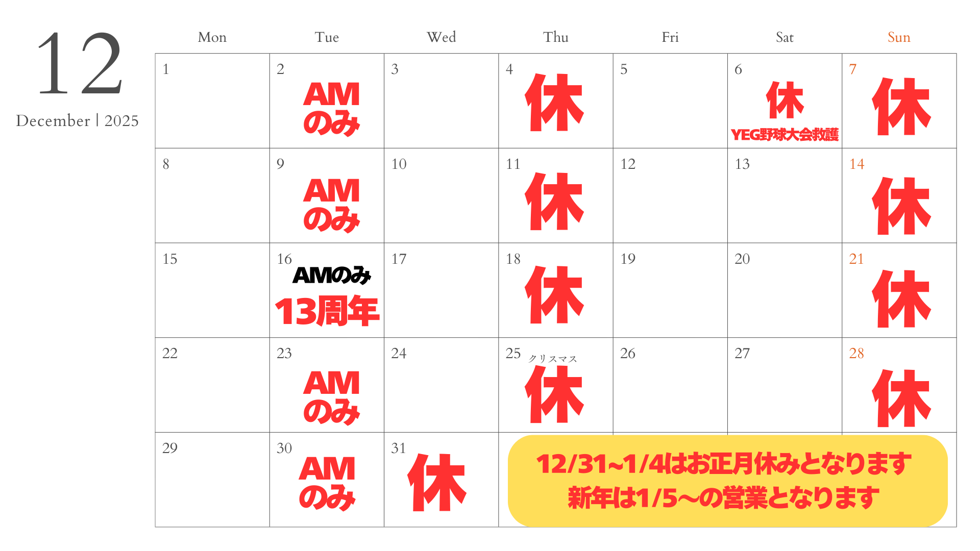 12/6は YEG(商工会議所青年部)の野球大会の救護のためお休みです。