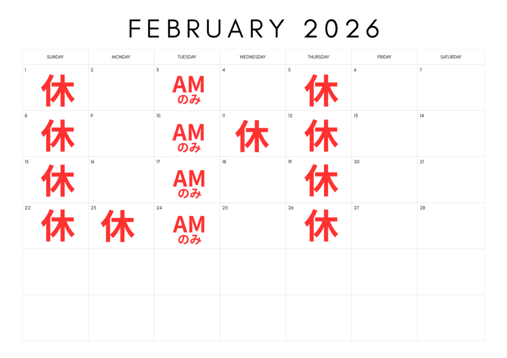 2/11(水・祝)、2/23(月・祝)がお休みとなります!